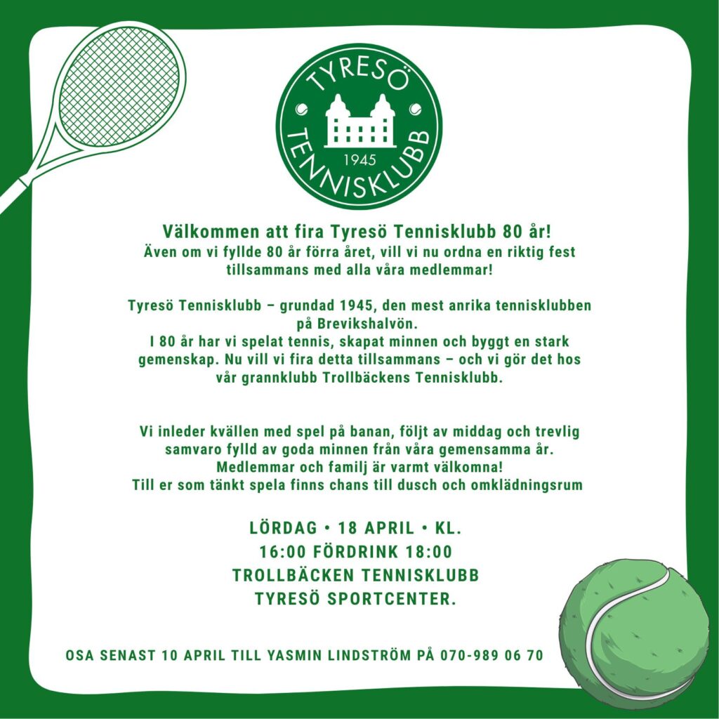Lördag 18 april på Tyresö Sportcenter. Från kl 16 kan man spela tennis, padel eller pickle ball. Efter dusch och ombyte blir det välkomstdrink, middag och trevlig samvaro.